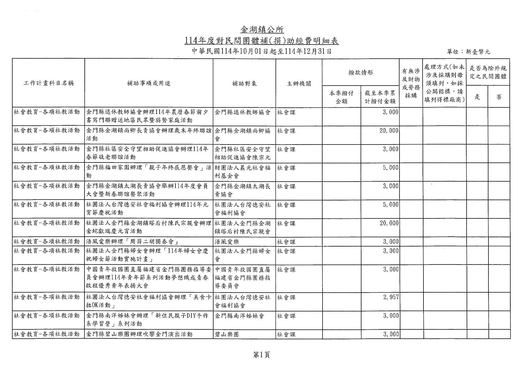 114年第4季對民間團體補(捐)助經費明細表