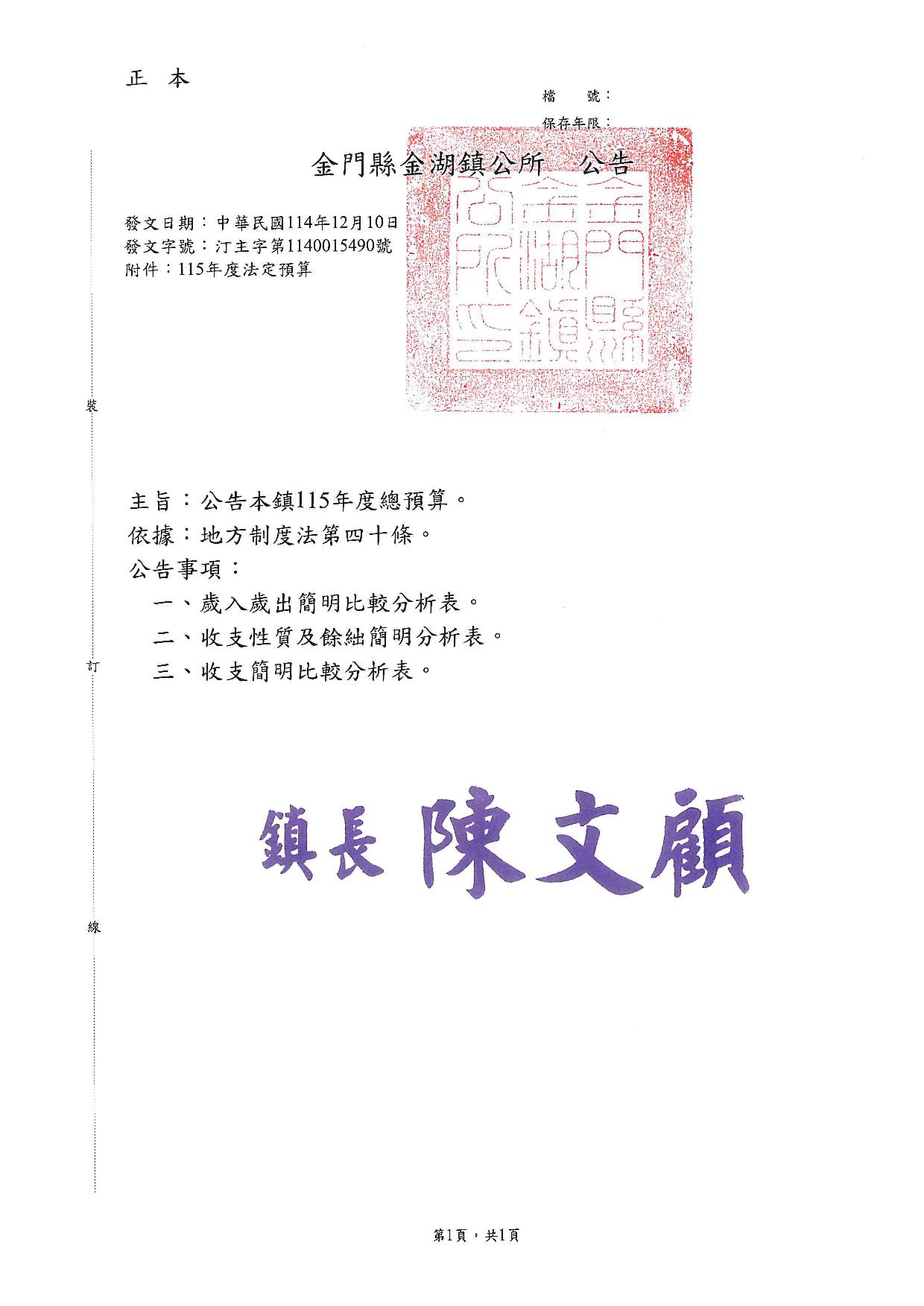 金湖鎮115年度總預算