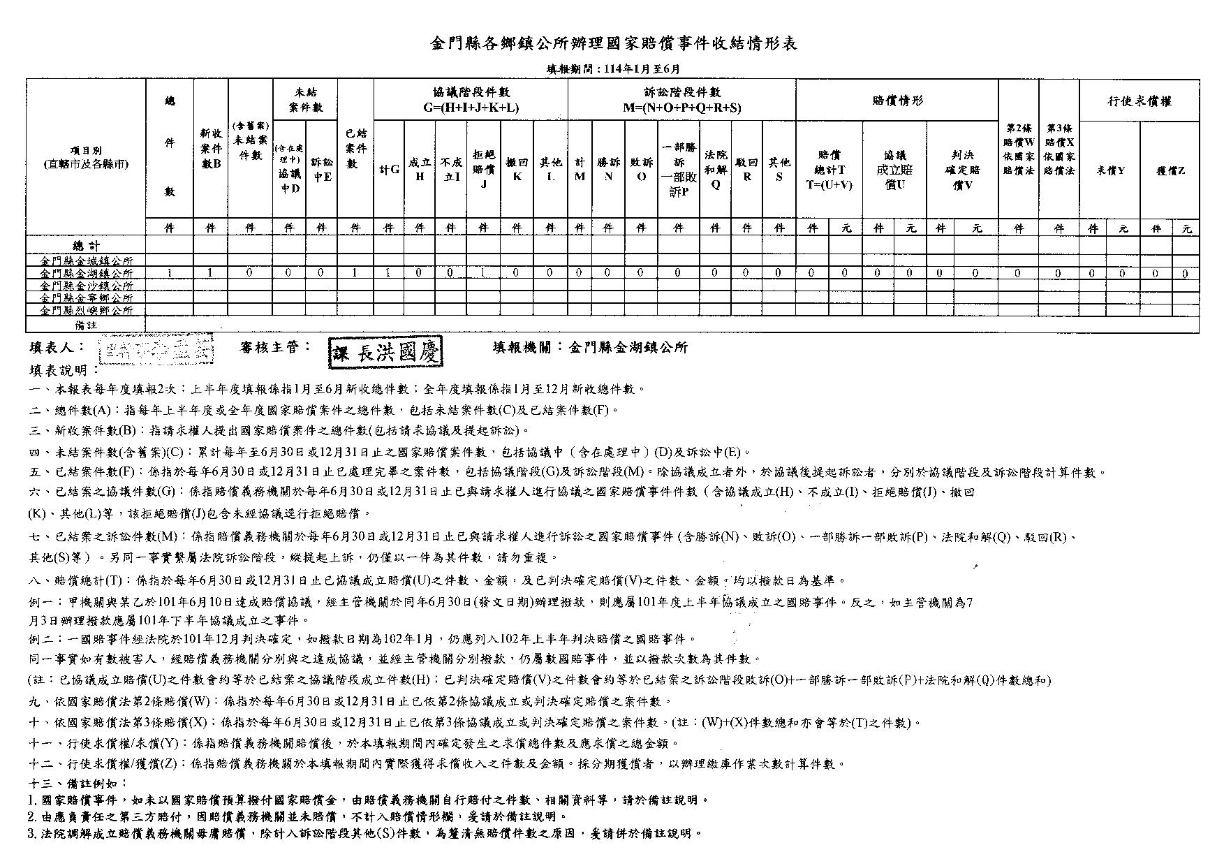 金門縣各鄉鎮公所辦理國家賠償事件收結情形表