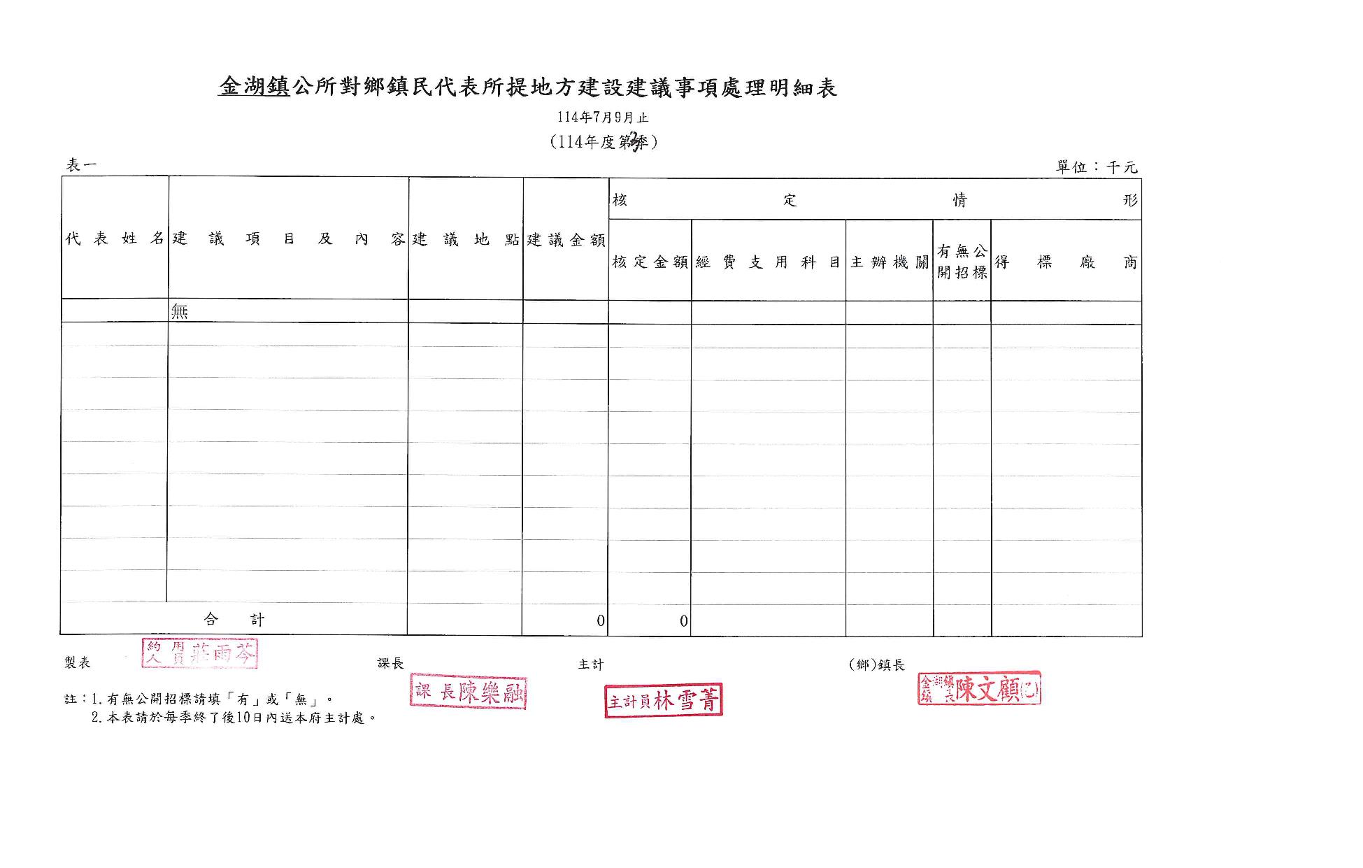 114年第3季對鎮民代表所提地方建設建議事項處理明細表