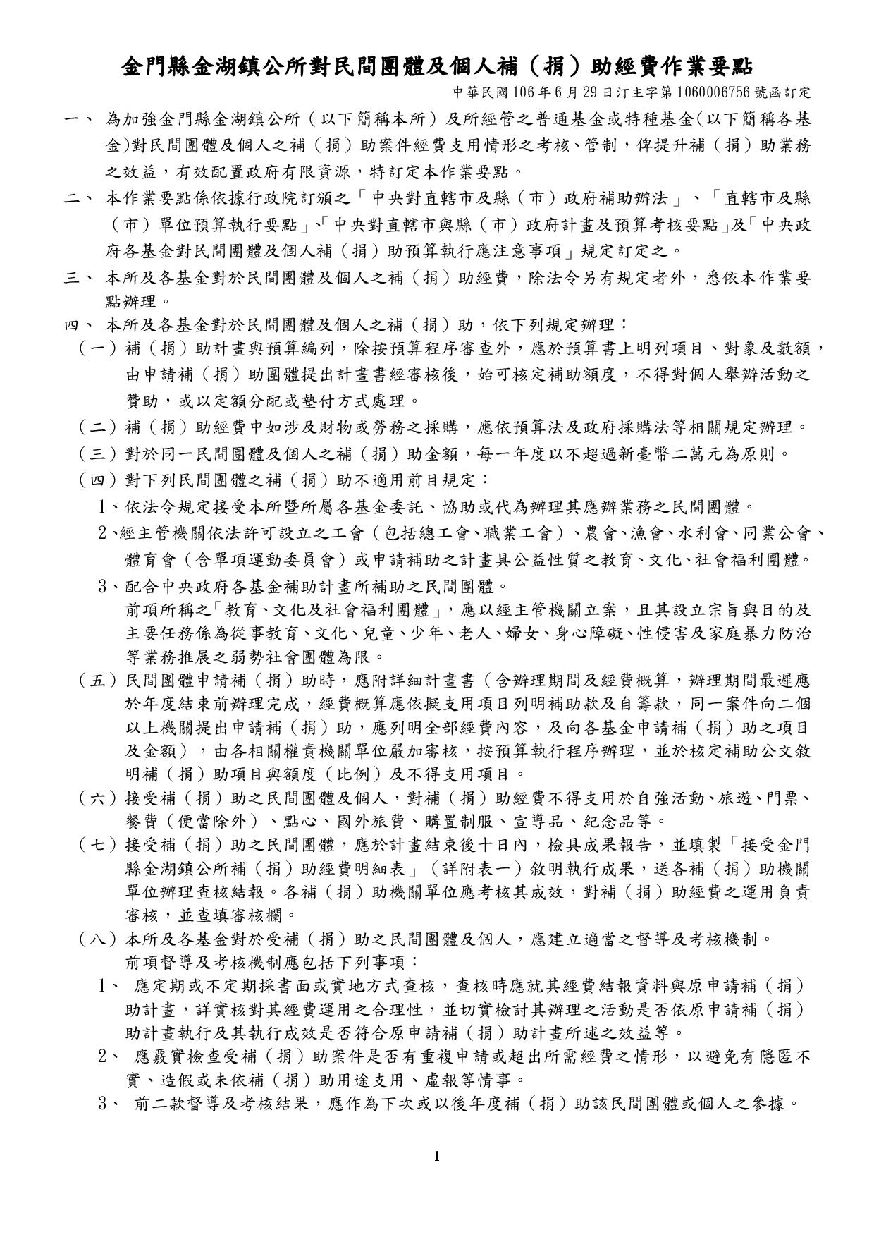 為加強金門縣金湖鎮公所(以下簡稱本所)及所經管之普通基金或特種基金(以下簡稱各基金)對民間團體及個人之補(捐)助案件經費支用情形之考核、管制,俾提升補(捐)助業務之效益,有效配置政府有限資源,特訂定本作業要點。