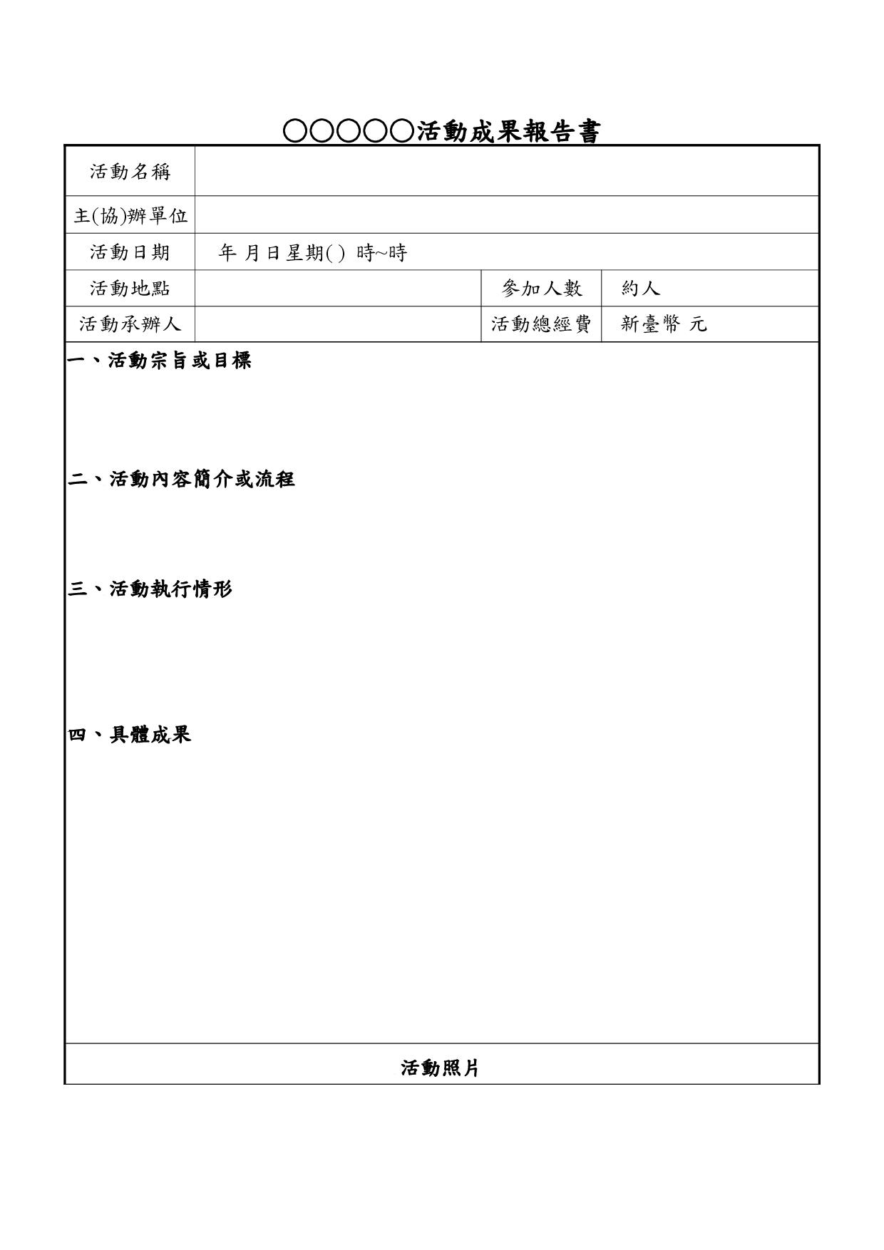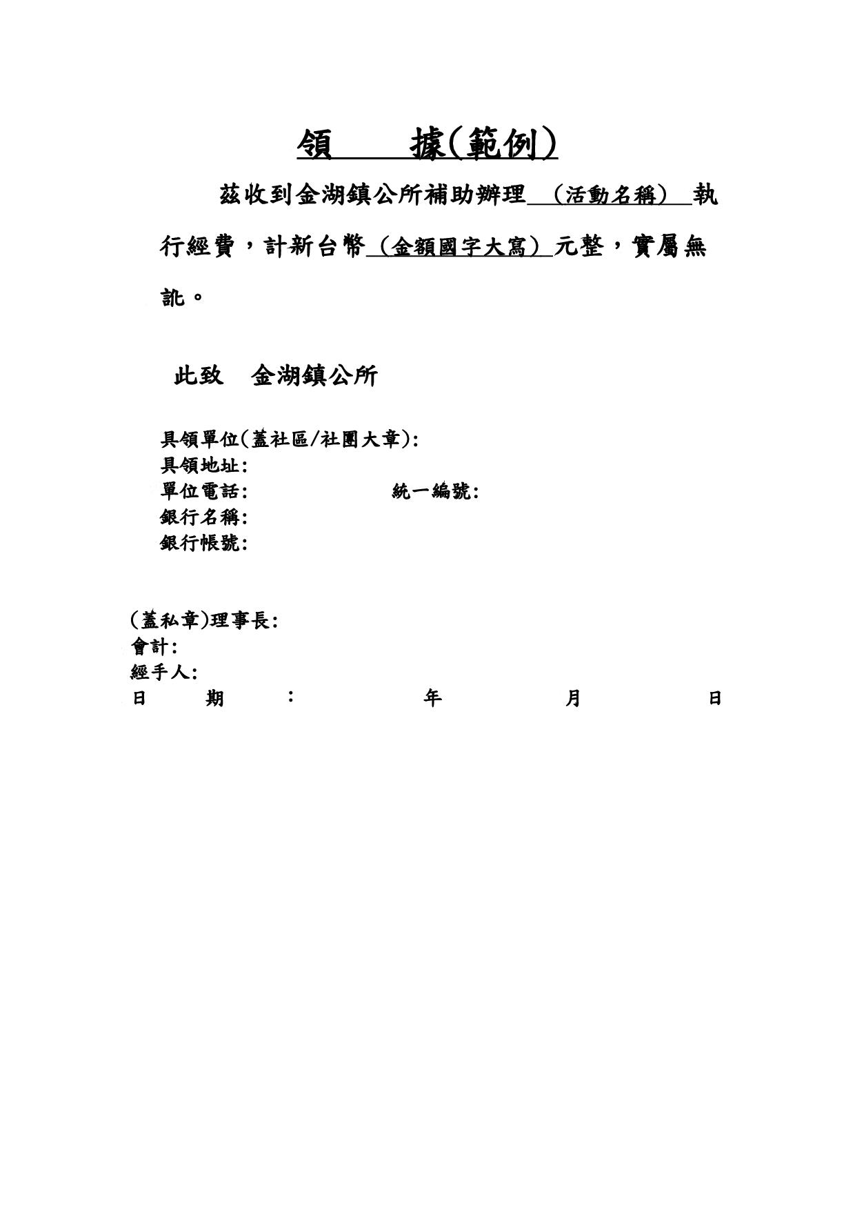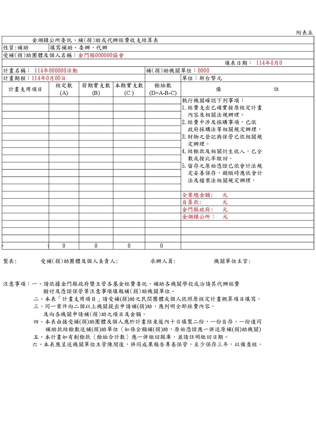 (七)接受補(捐)助之民間團體,應於計畫結束後十日內,檢具成果報告,並填製「接受金門縣金湖鎮公所補(捐)助經費明細表」(詳附表一)敘明執行成果,送各補(捐)助機關單位辦理查核結報。各補(捐)助機關單位應考核其成效,對補(捐)助經費之運用負責審核,並查填審核欄。