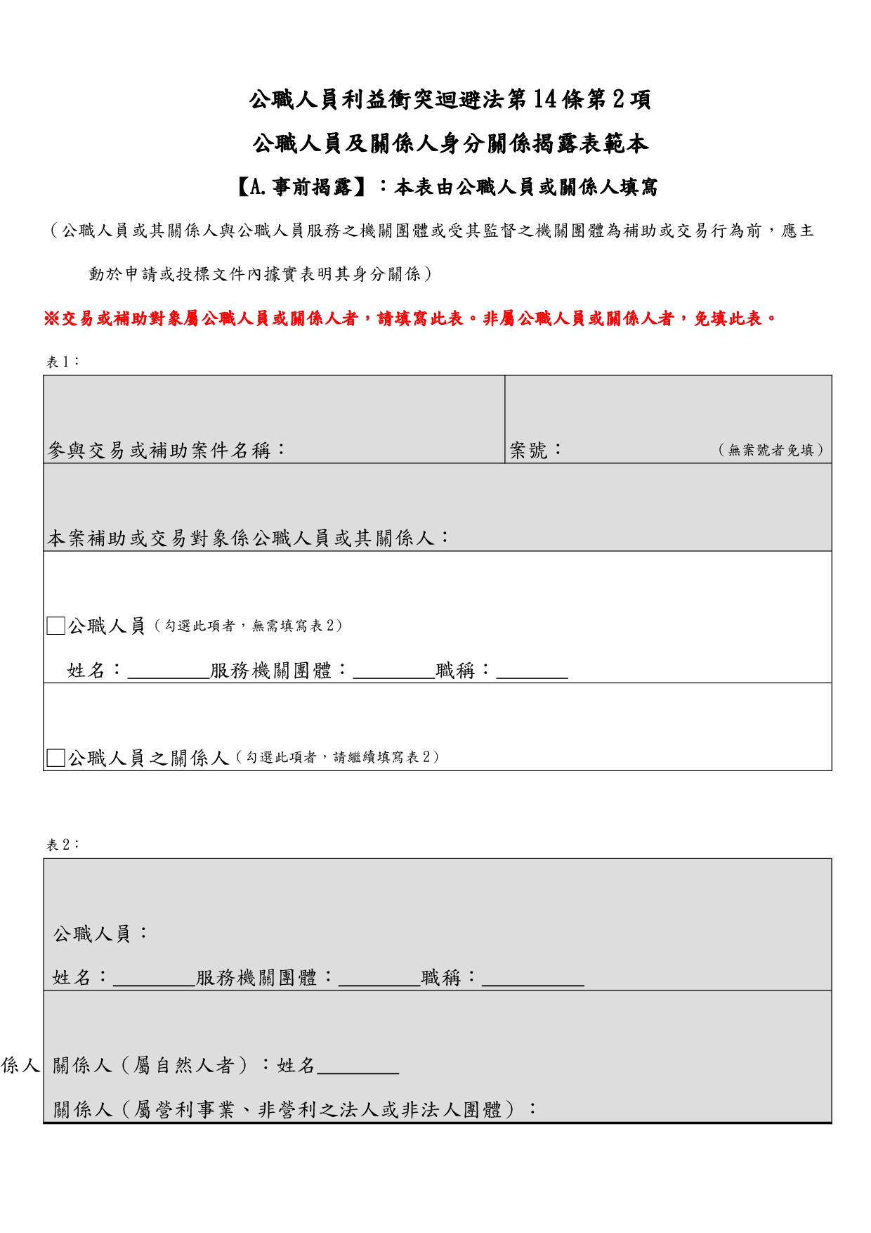 (三)【A.事前揭露】公職人員及關係人身分關係揭露表、【B.事後公開】公職人員及關係人身分關係事後公開表。