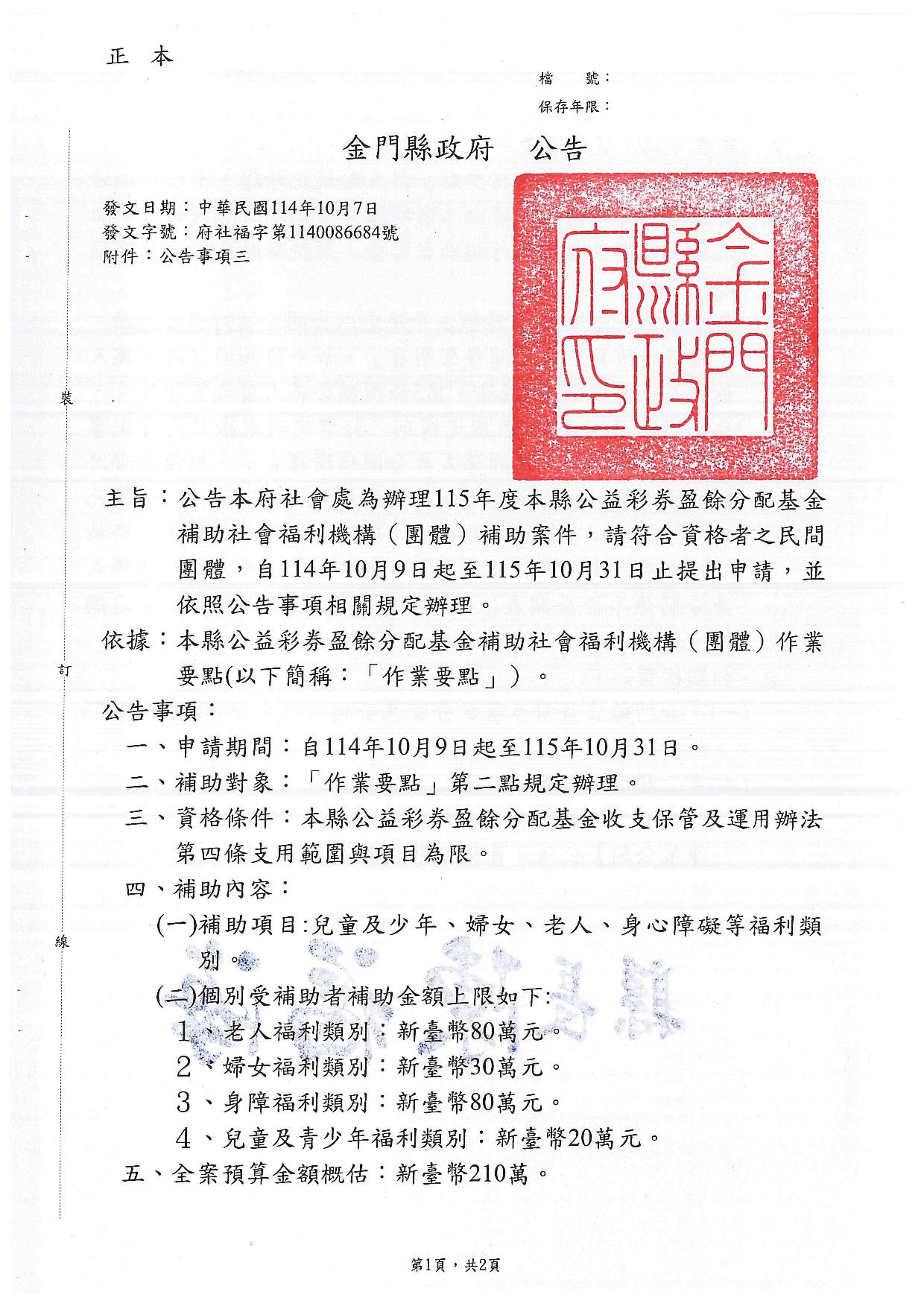 公告115年度「金門縣政府社會處為辦理本縣公益彩券盈餘分配基金補助社會福利機構(團體)補助案件」案