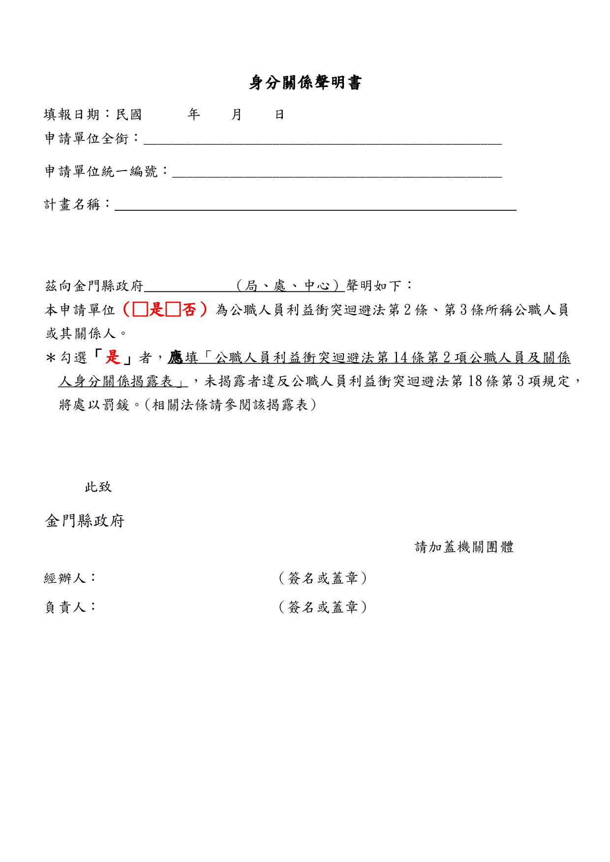 八、身分關係揭露說明:申請依法令規定以公開方式辦理之補助,申請時請填具「身分關係聲明書」,如申請補助者為公職人員利益衝突迴避法第2條、第3條所稱公職人員或其關係人,且屬同法第14條第2項規定情形,於申請時應檢具「【A.事前揭露】公職人員及關係人身分關係揭露表」,未揭露者將依公職人員利益衝突迴避法第18條第3項規定處新臺幣5萬元以上50萬元以下罰鍰,並得按次處罰;本機關(單位)於補助行為成立後,應填寫「【B.事後公開】公職人員及關係人身分關係事後公開表」並將身分關係公開於本府社會處網站。