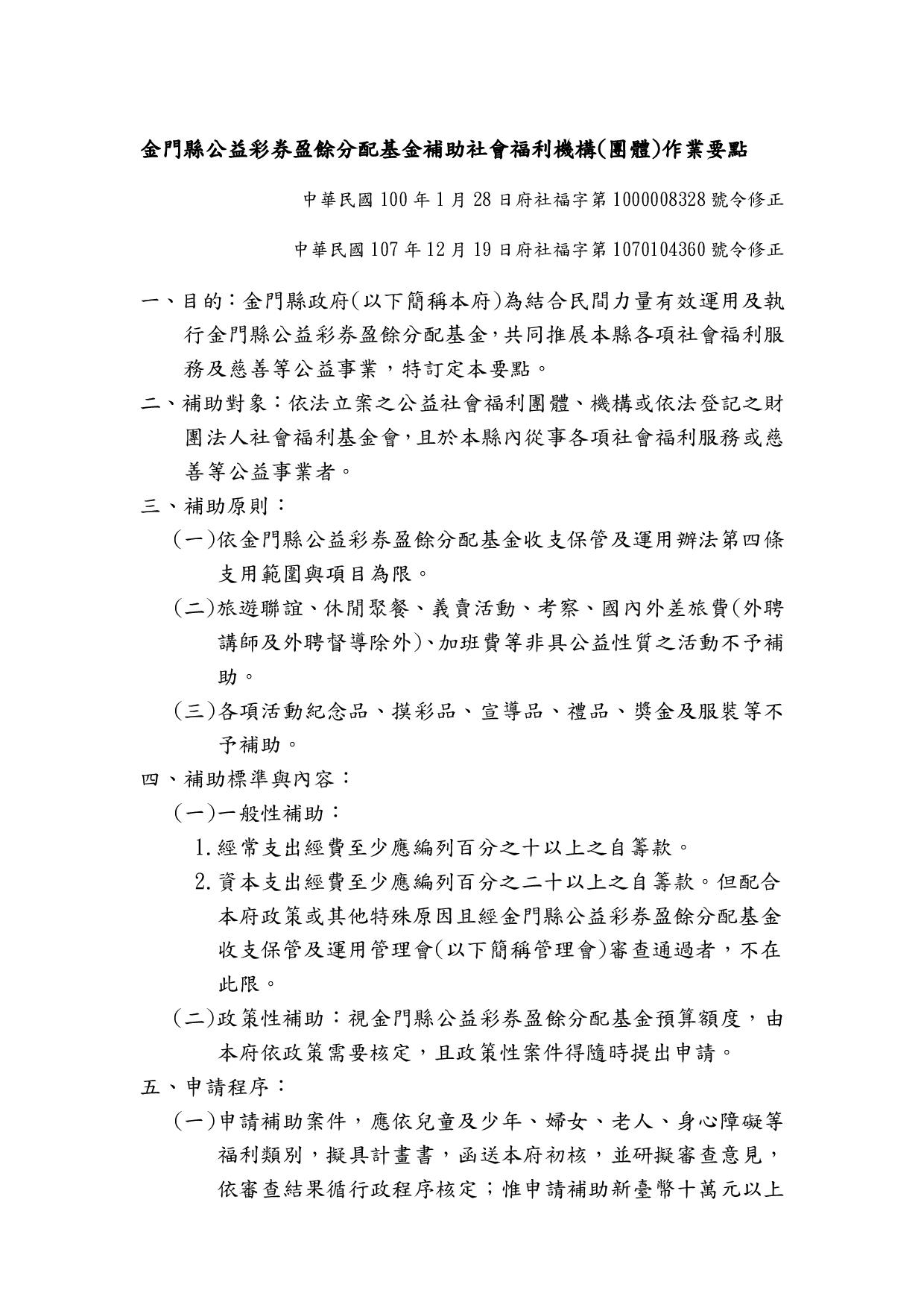 (一)「金門縣公益彩券盈餘分配基金補助社會福利機構(團體)作業要點」。