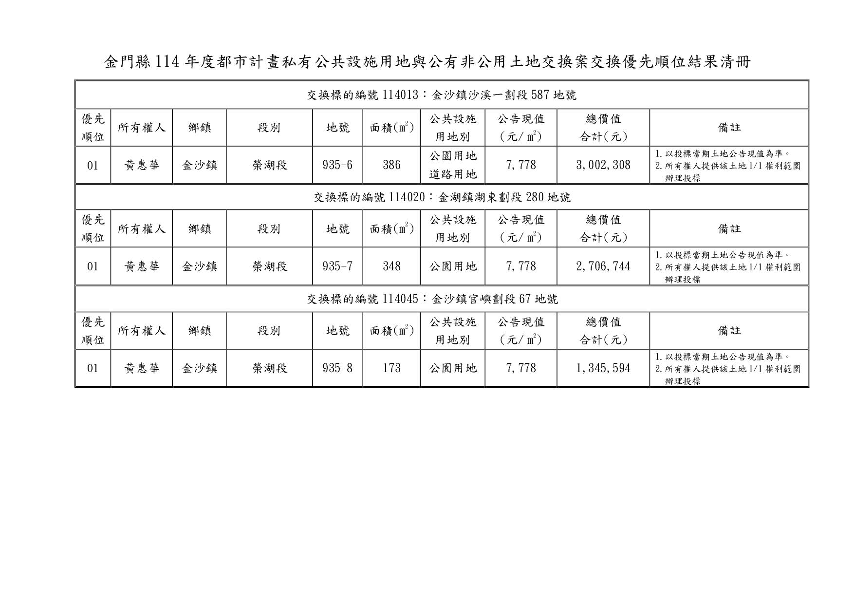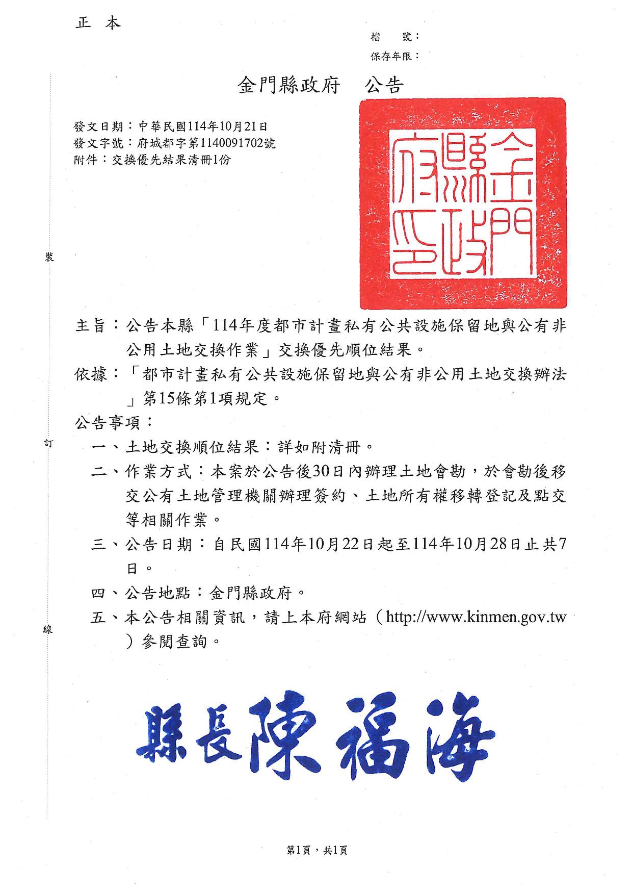 主旨:公告本縣114年度「都市計畫私有公共設施保留地與公有非公用土地交換作業」交換優先順位結果。