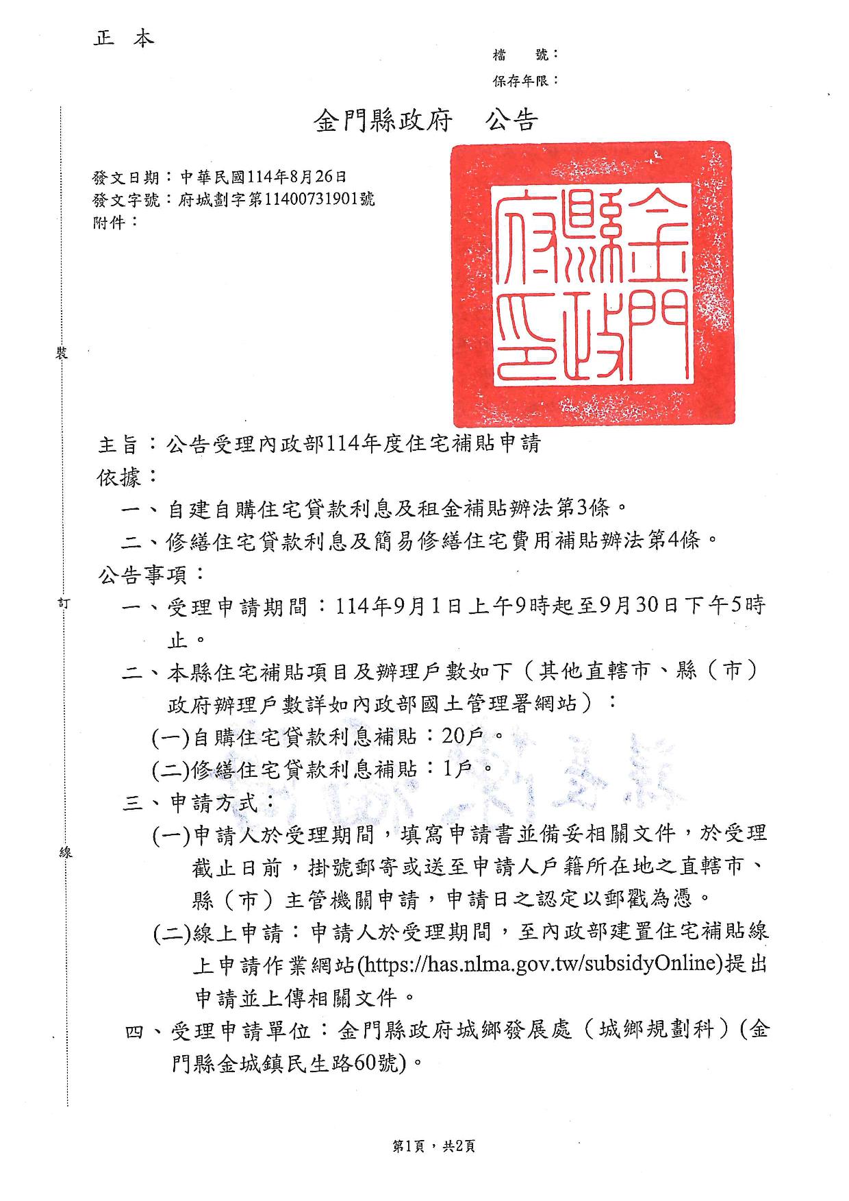 主旨:公告受理内政部114年度住宅補貼申请