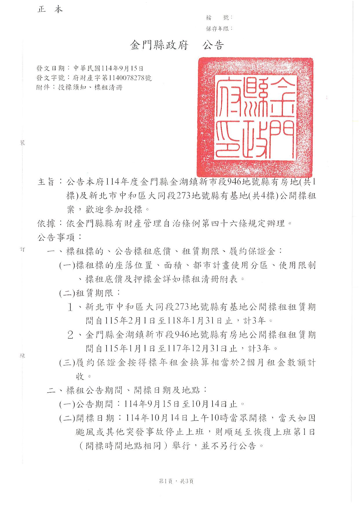 公開金門縣政府114年度金湖鎮新市段946地號縣有房地(門牌:金門縣金湖鎮漁市場9之1號)(共1標)及新北市中和區大同段273地號縣有基地(共4標)公開標租案公告,訂於114年10月14日(星期二)上午10時於本府第三會議室(地址:金門縣金城鎮民生路60號)辦理公開標租作業。