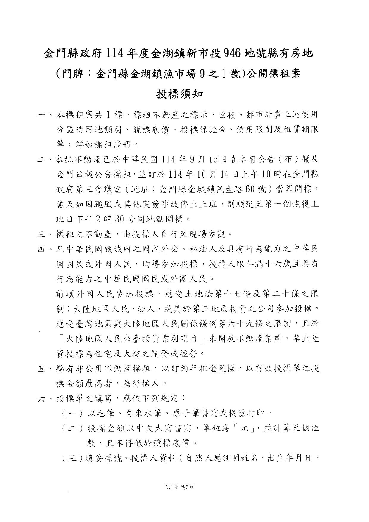 公開金門縣政府114年度金湖鎮新市段946地號縣有房地(門牌:金門縣金湖鎮漁市場9之1號)(共1標)及新北市中和區大同段273地號縣有基地(共4標)公開標租案公告,訂於114年10月14日(星期二)上午10時於本府第三會議室(地址:金門縣金城鎮民生路60號)辦理公開標租作業。 連絡方式:金門縣政府,地址:89345金門縣金城鎮民生路60號,聯絡電話:082-318823 #62223 朱小姐