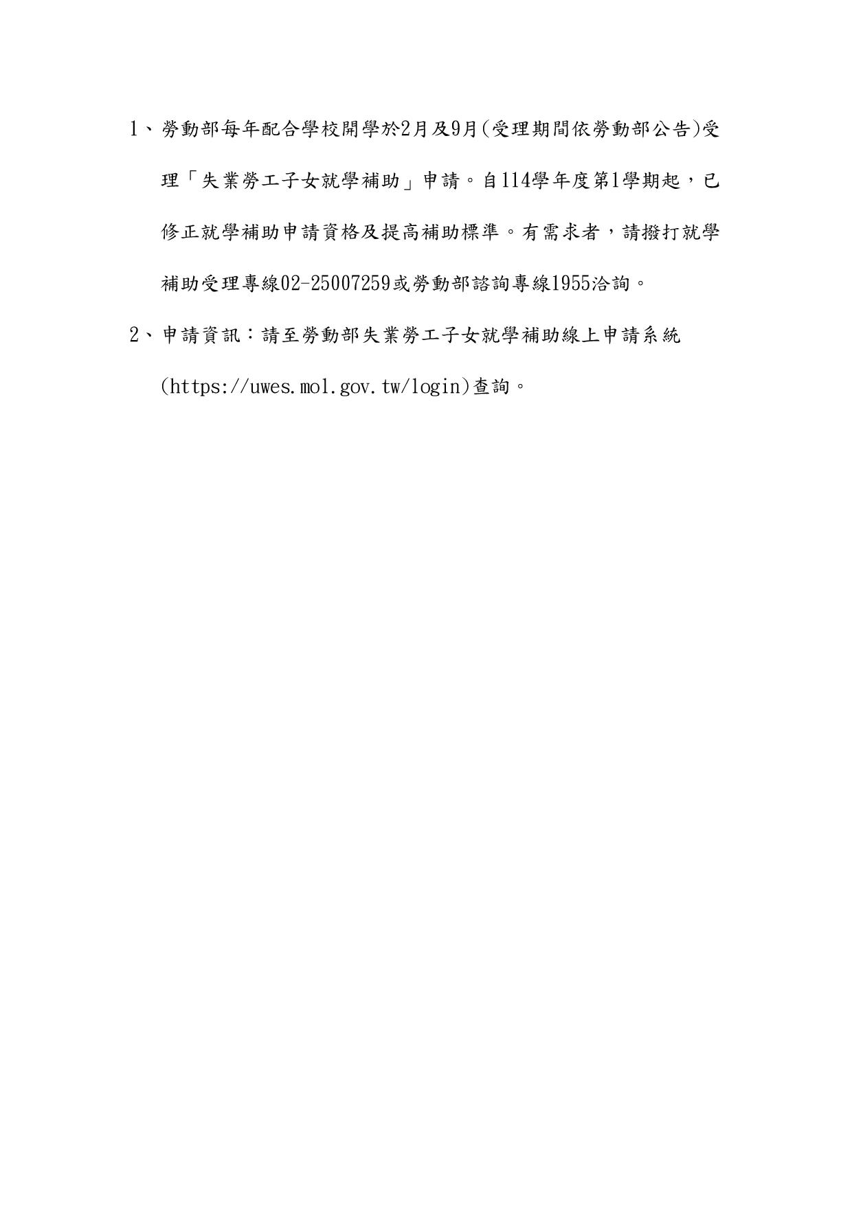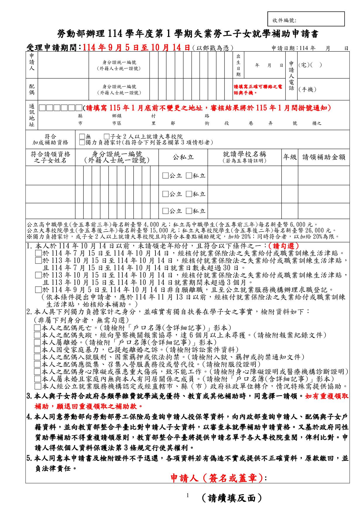 勞動部114學年度第1學期失業勞工子女就學補助,自114年9月5日起受理申請,至114年10月14日截止。