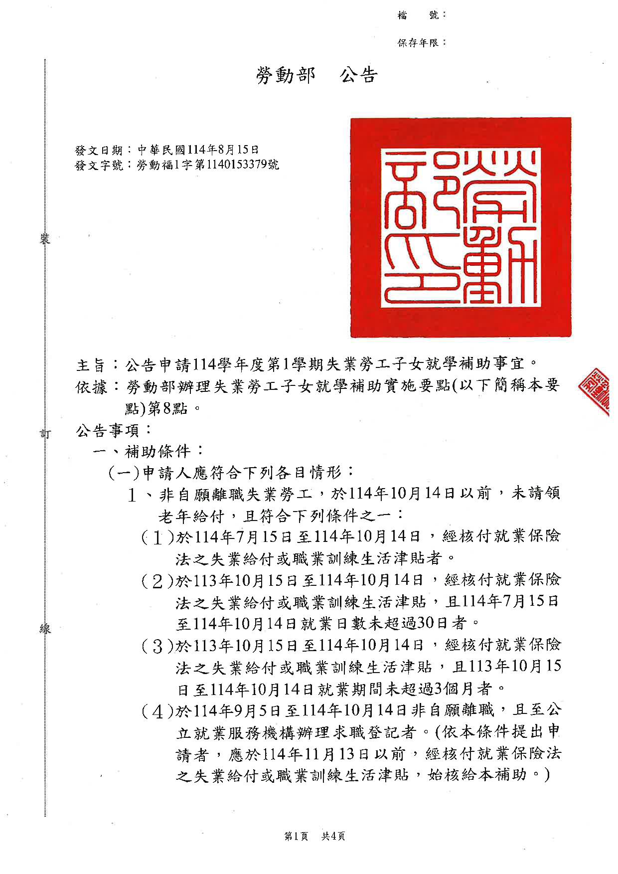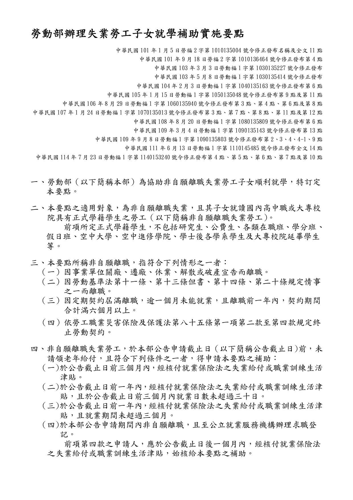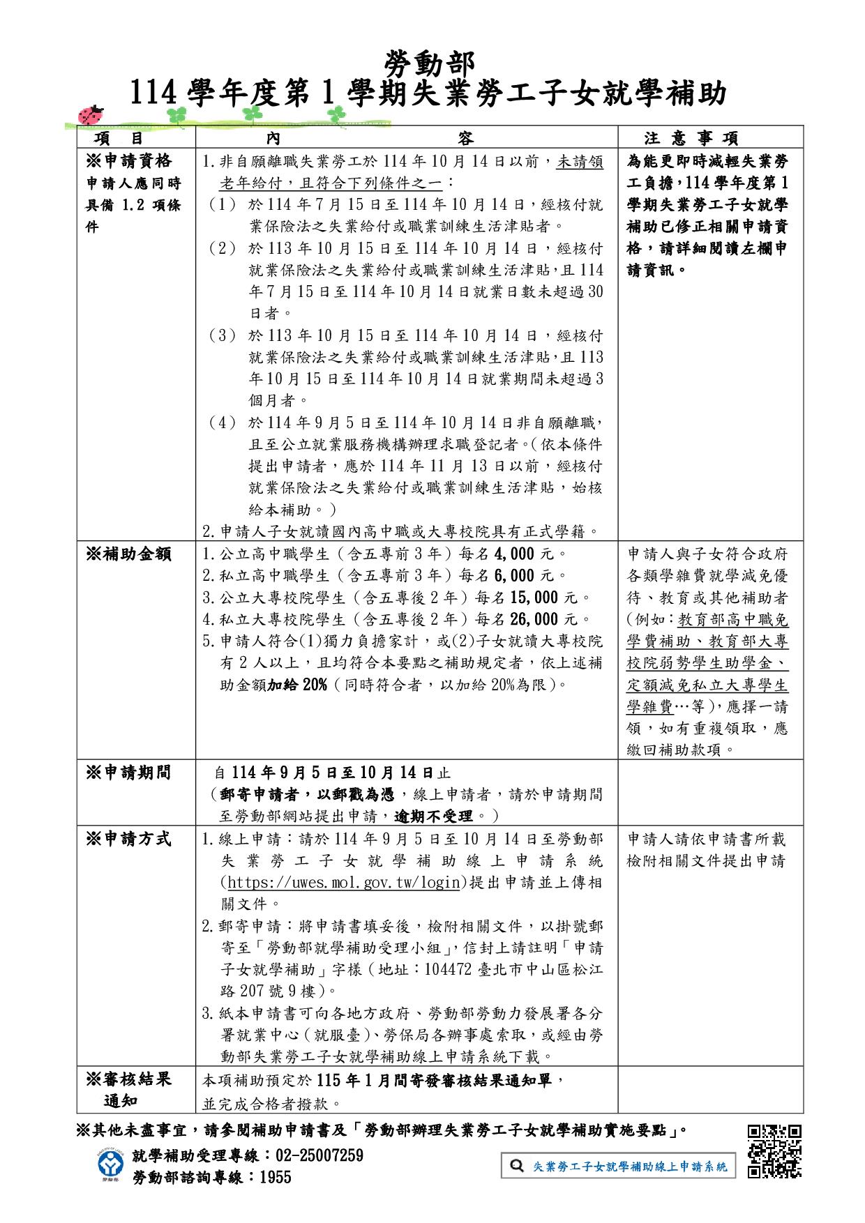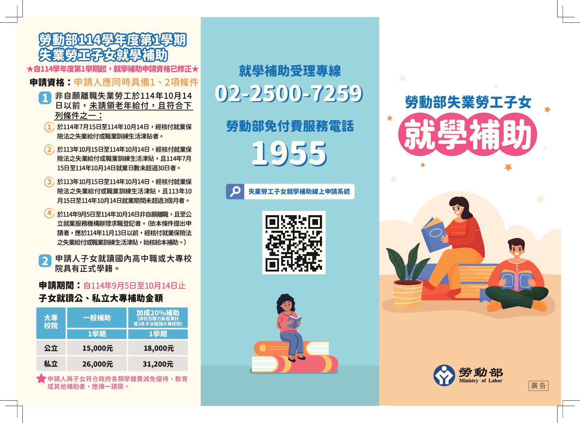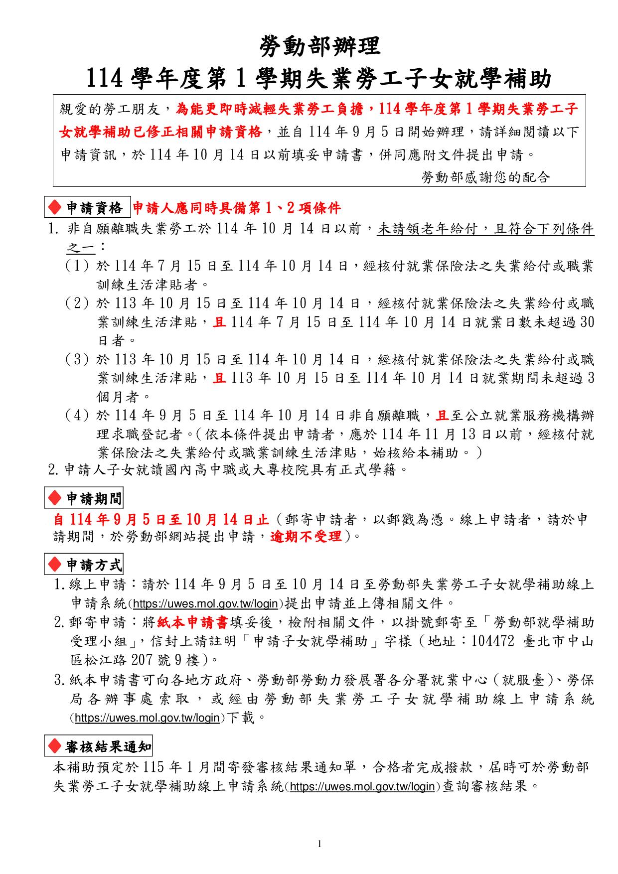 勞動部114學年度第1學期失業勞工子女就學補助,自114年9月5日起受理申請,至114年10月14日截止,檢送公告、實施要點、申請書表、簡章、宣傳單及摺頁。